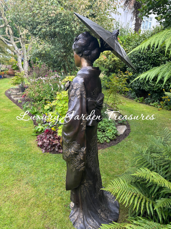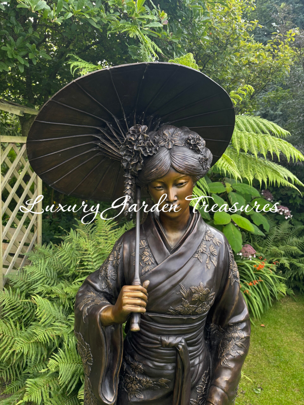 A graceful tribute to timeless elegance, this exquisite bronze sculpture captures the serene beauty of a traditional Japanese Geisha. Standing at 5ft 8in tall, her delicate posture, flowing robes, and finely detailed fan evoke a quiet dignity and cultural richness. Perfect for creating a peaceful, Zen-inspired focal point in any luxury garden, courtyard, or oriental-themed space. Cast in solid bronze with a rich patina, she is built to last for generations — a true heirloom piece that commands admiration.
