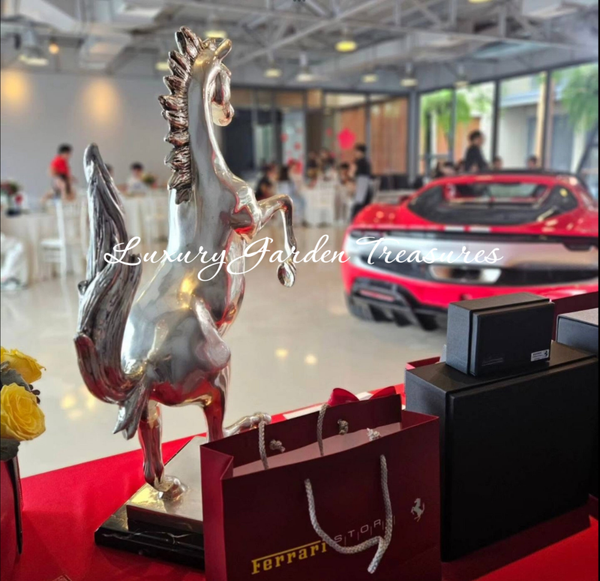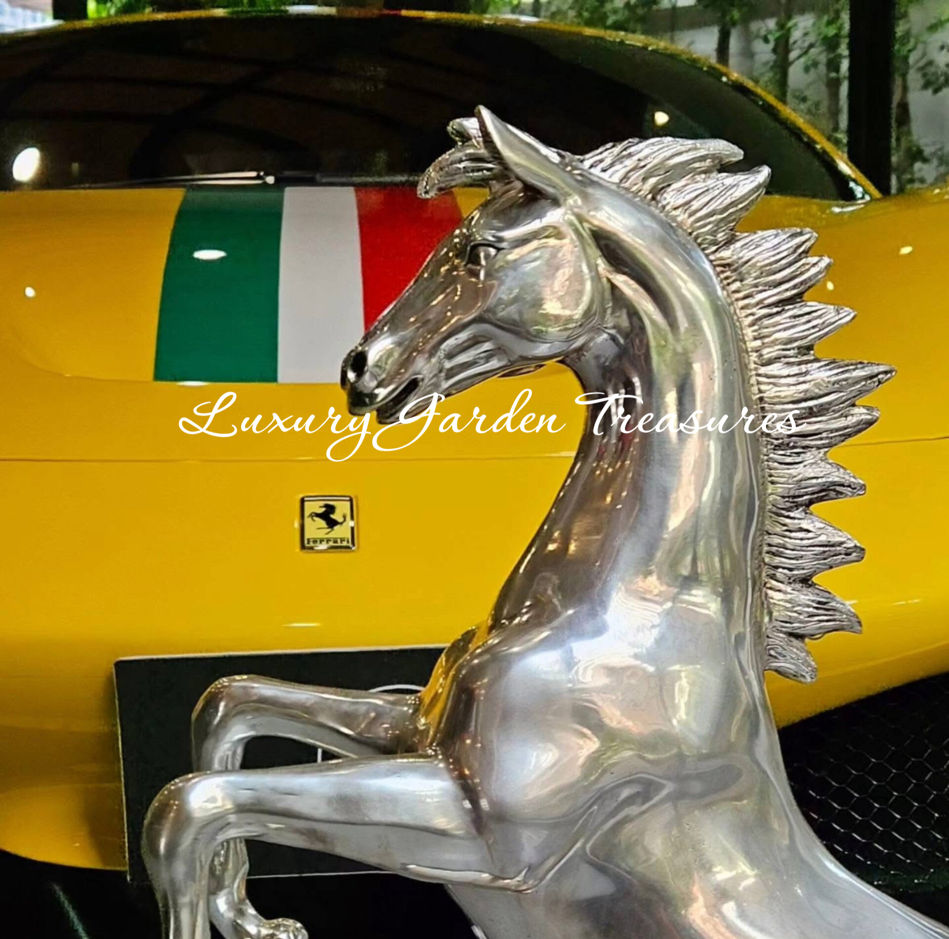 A luxury statement piece for collectors and car lovers alike. This large Sliver and Gold prancing horse stands 26” tall and shines with automotive energy. Ideal for car fans, garage art, or premium home decor.