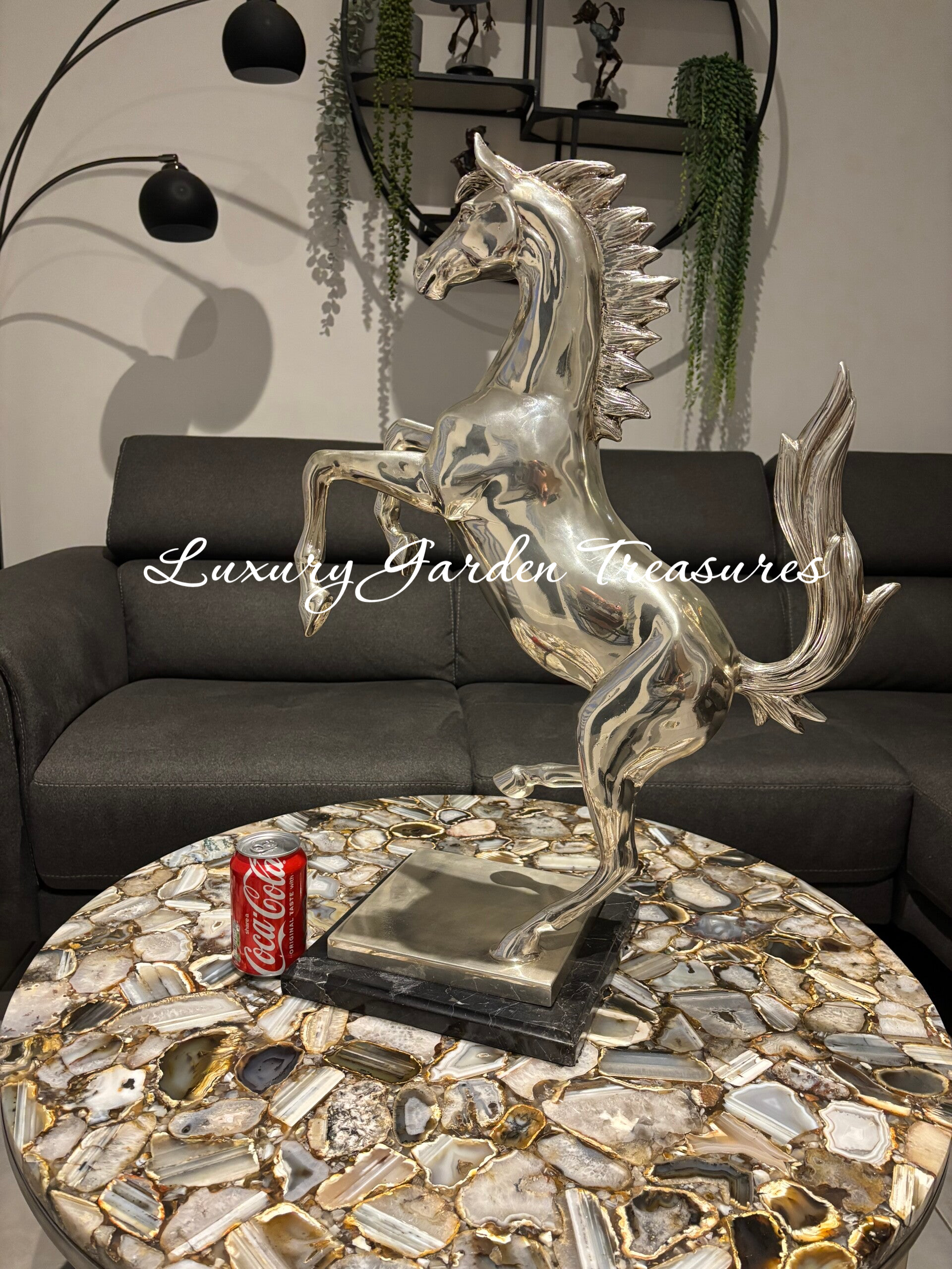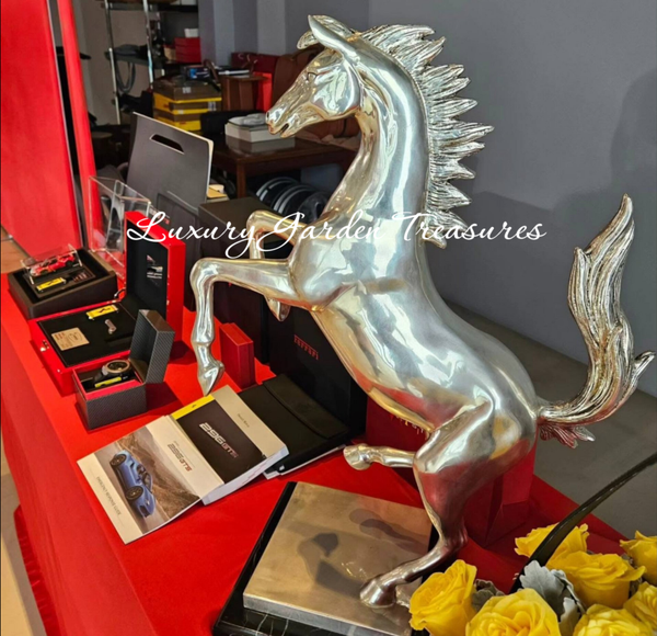 Commanding presence meets elegance in this bold silver prancing horse sculpture with a mirror-polished finish and dynamic rearing posture, it brings instant drama and prestige to any interior.