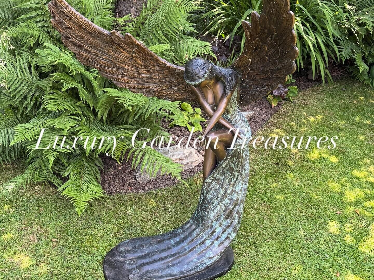 Standing with divine grace, this beautifully crafted Bronze Angel. Sculpted in exquisite detail, her flowing gown, outstretched wings, and serene expression evoke a sense of peace and presence. Suitable for luxury gardens, memorial spaces, or elegant estate entrances, this timeless piece offers a celestial focal point for any setting. She stands out when elevated ie standing on a wall.