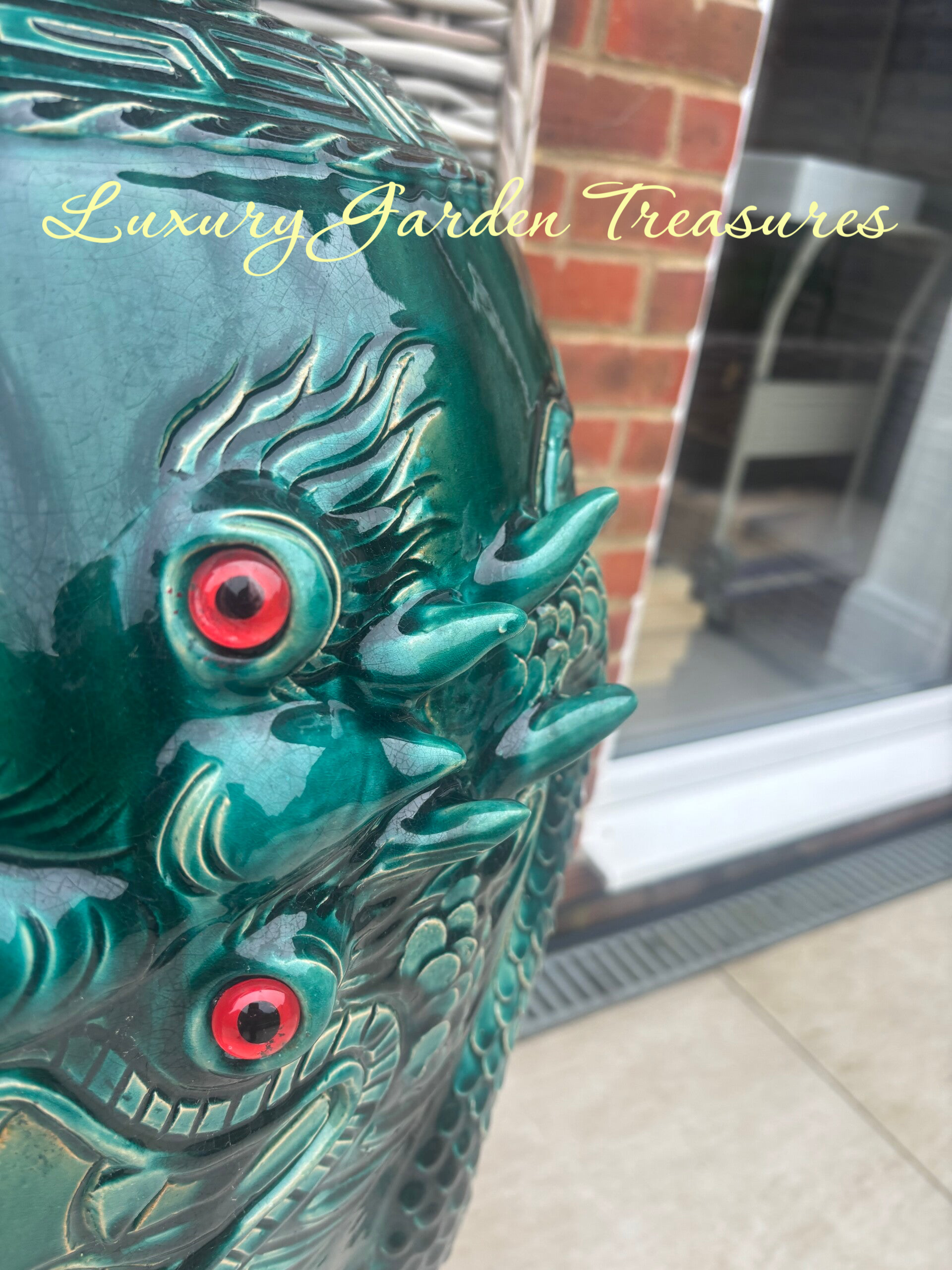 This commanding tall pot is a striking piece of oriental artistry, hand-crafted in ceramic and finished with a lustrous emerald-green glaze. Wrapped around its body is a powerful raised dragon, complete with fine scales, horns, and expressive features, symbolising strength, prosperity, and protection.