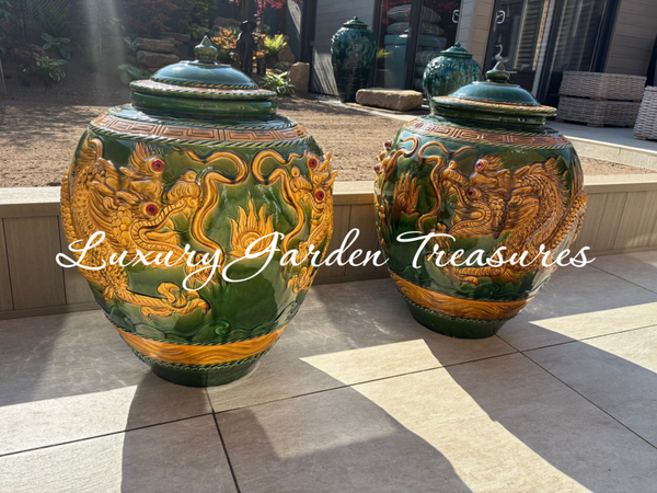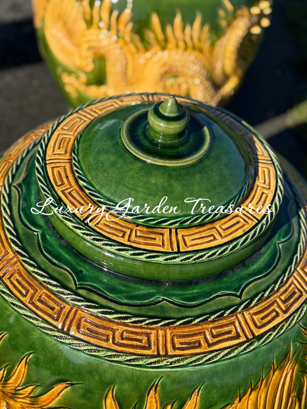 The dragon, a symbol of power, strength, and prosperity, coils dynamically around the pot, giving the piece a sense of movement and life. Its deep green and gold tones make it an ideal centrepiece for both luxury interiors and landscaped gardens, while its timeless design makes it equally suited as a collector’s treasure.