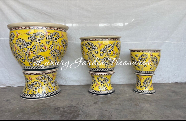 Bring a burst of colour and elegance to your garden or interior space with these exquisite hand-painted ceramic pots, featuring delicate hummingbirds dancing among black floral blooms.