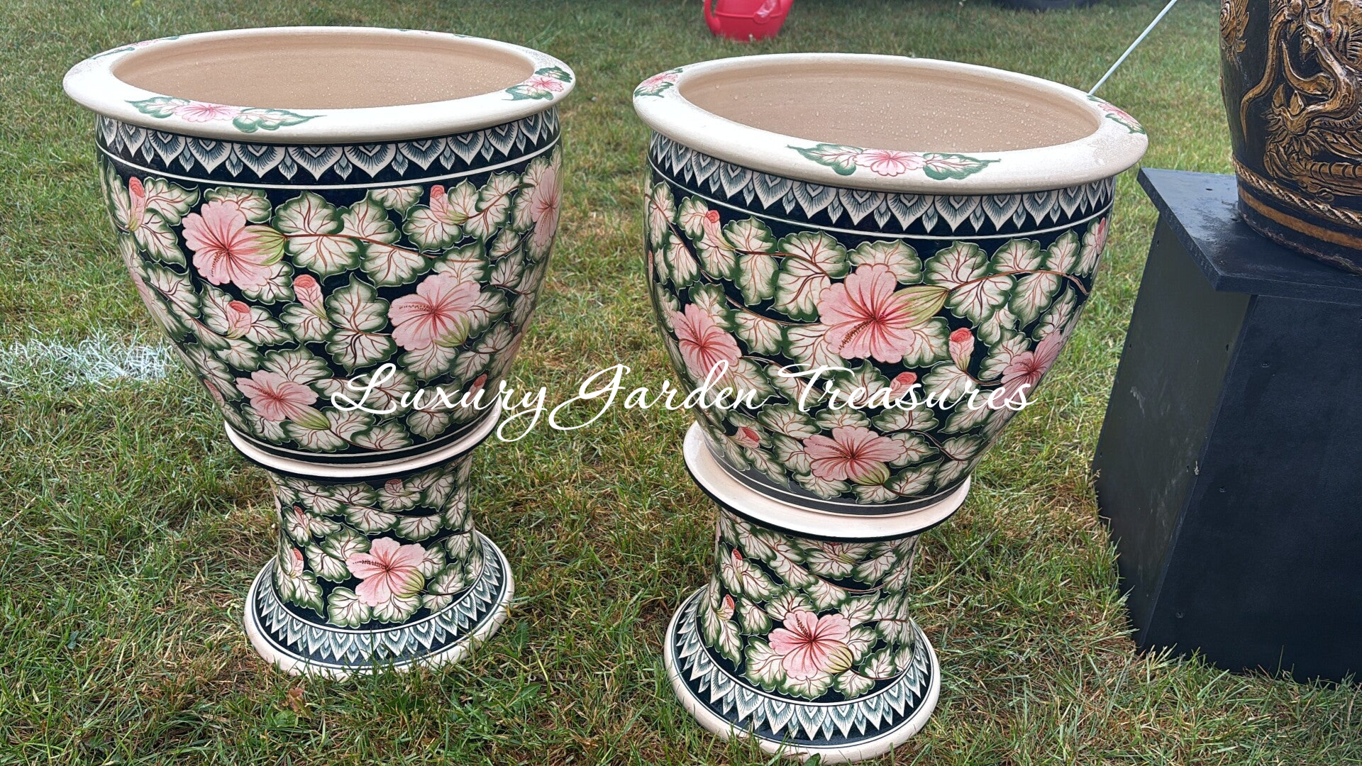 Graceful and romantic, these hand-painted ceramic pots are adorned with lush green foliage and soft pink hibiscus blooms, each brushstroke bringing the tropical charm of the South Pacific to life.