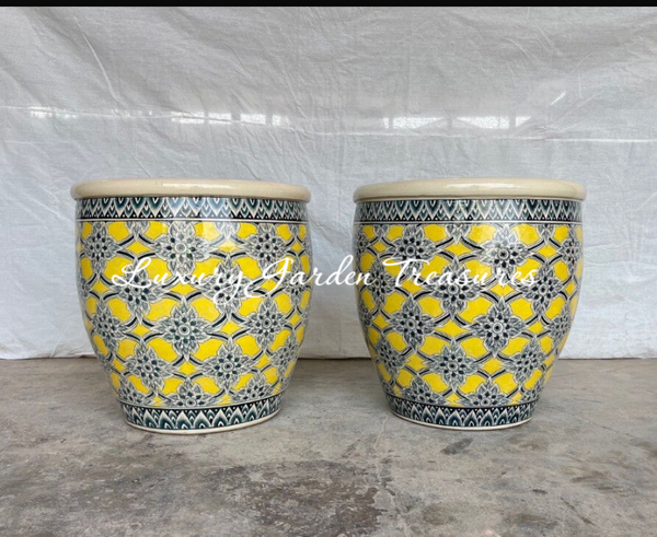 Elevate your garden, terrace, or interior space with this exquisite matching pair of hand-painted glazed ceramic planters. Featuring a vibrant sunshine yellow backdrop adorned with intricate indigo floral and geometric patterns, each piece is a true work of art.