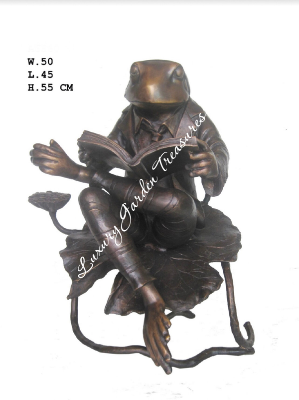 Seated gracefully on a lotus leaf, dressed in a jacket and tie, and engrossed in his book, this characterful frog makes a delightful statement indoors or in the garden. The piece is beautifully detailed, from the folds of his clothing to the textured leaf base, and finished with a rich bronze patina that will stand the test of time.