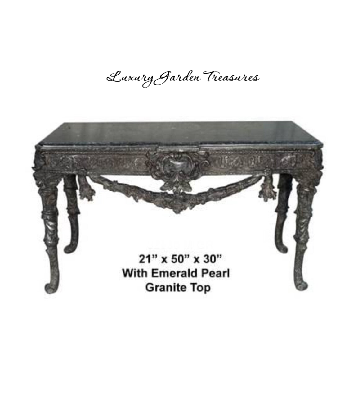 A statement piece of timeless elegance, this console table combines intricate craftsmanship with the beauty of natural stone. The ornate bronze frame features exquisite detailing and decorative flourishes, showcasing traditional artistry and strength. Its top is finished with a striking Emerald Pearl granite surface, renowned for its deep black tones interwoven with shimmering green and silver crystals that catch the light beautifully.