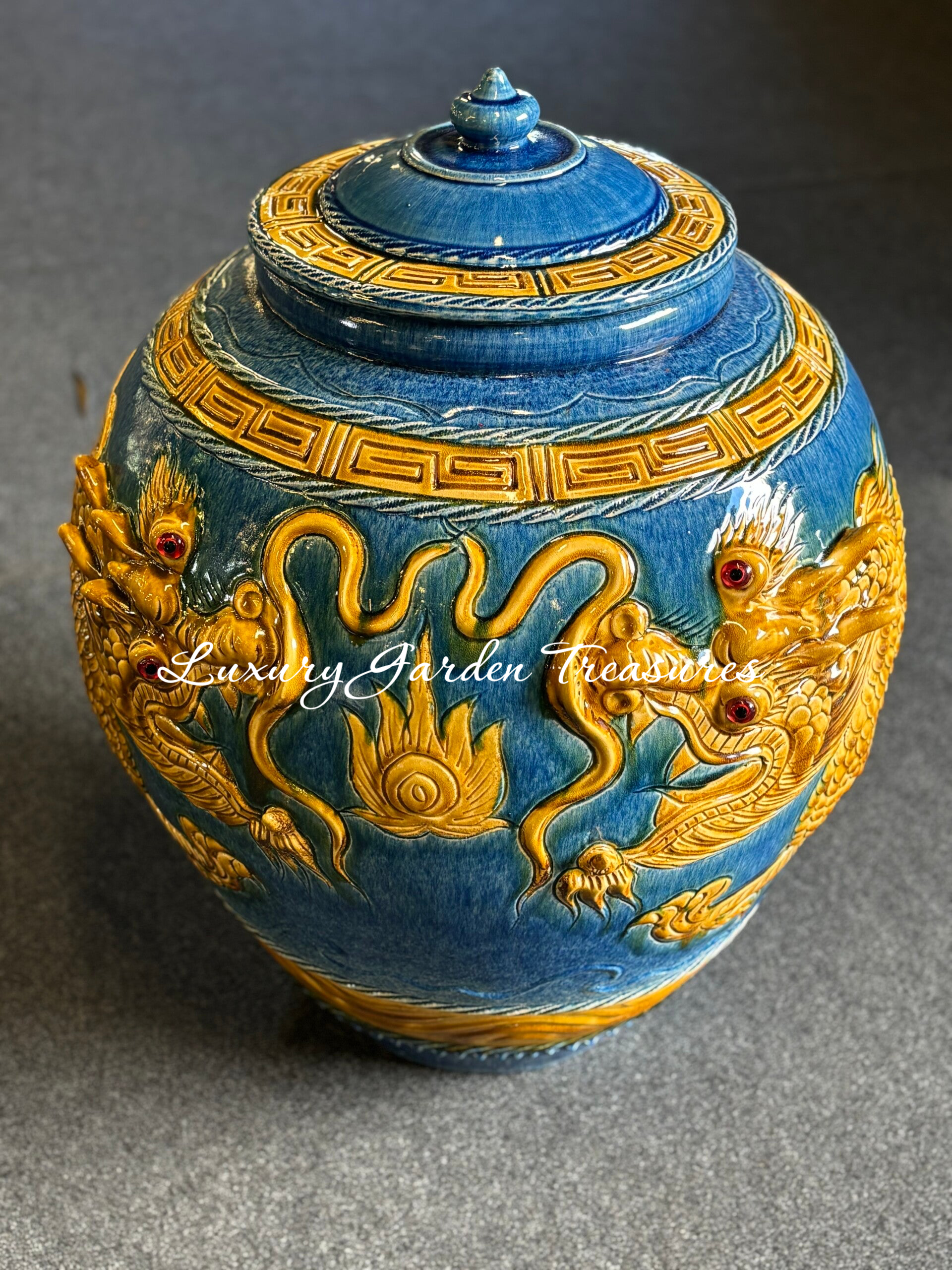 • Design: Embossed golden dragon wrapped around a Jean blue Finish: Gloss jean blue glaze with metallic gold embellishments