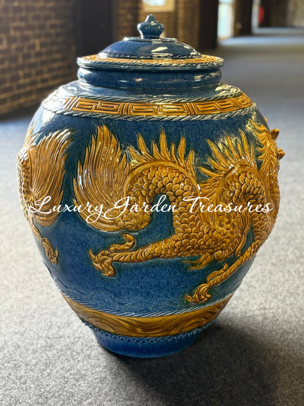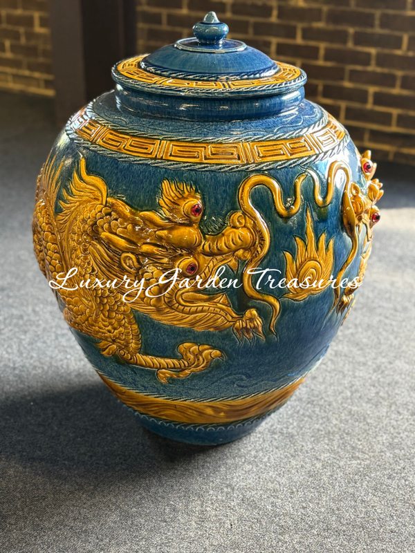 The dragon, a symbol of power, strength, and prosperity, coils dynamically around the pot, giving the piece a sense of movement and life. Its deep green and gold tones make it an ideal centrepiece for both luxury interiors and landscaped gardens, while its timeless design makes it equally suited as a collector’s treasure.