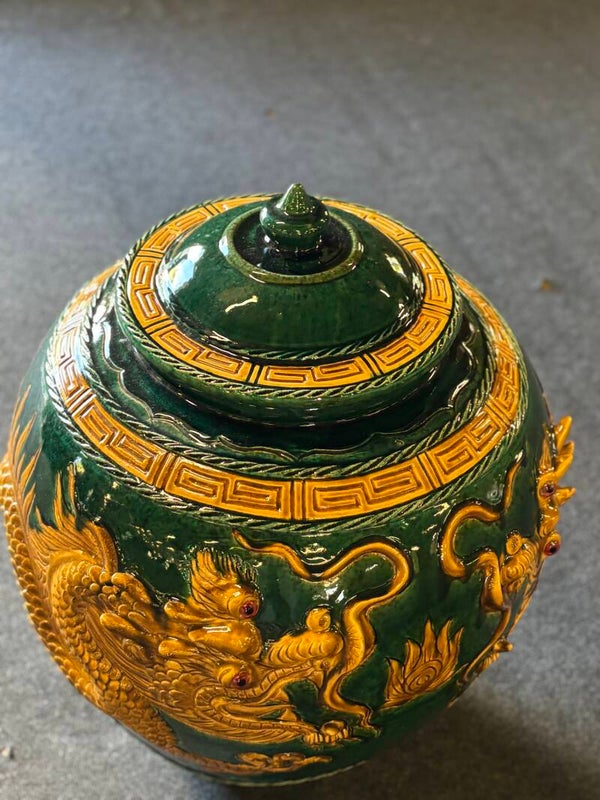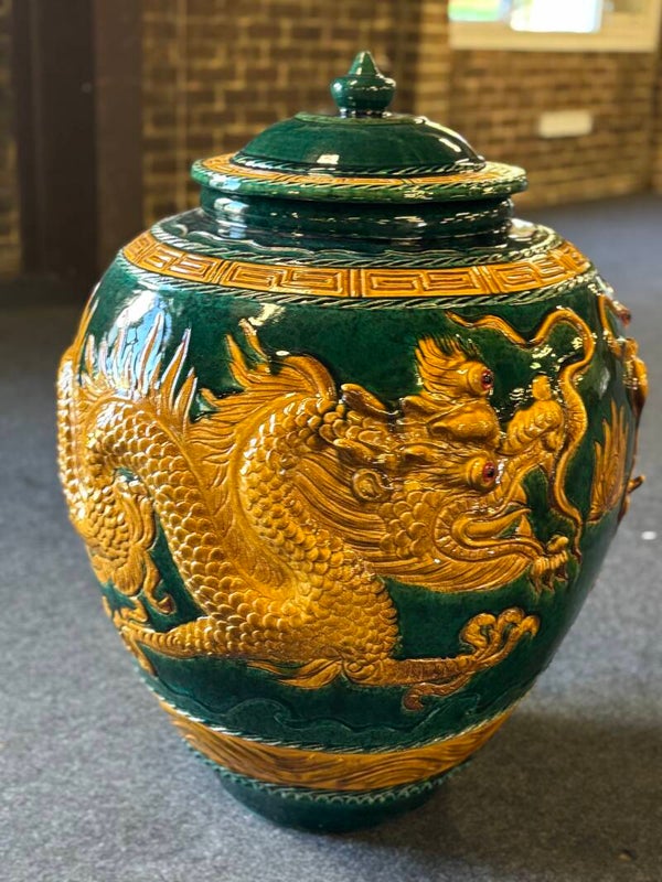 Fat Imperial Dark Green & Gold Dragon Pot with Lid