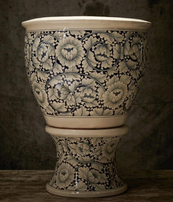 A beautifully hand-painted ceramic jardinière with matching pedestal base, finished in an elegant blue and ivory floral chinoiserie design. This striking statement planter blends timeless craftsmanship with classic luxury styling, making it ideal for conservatories, entranceways, terraces, and refined garden interiors.