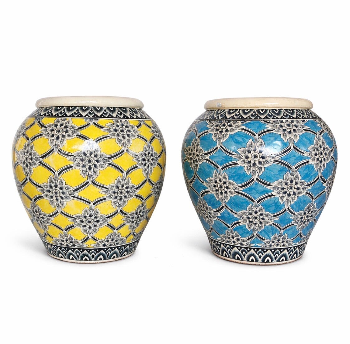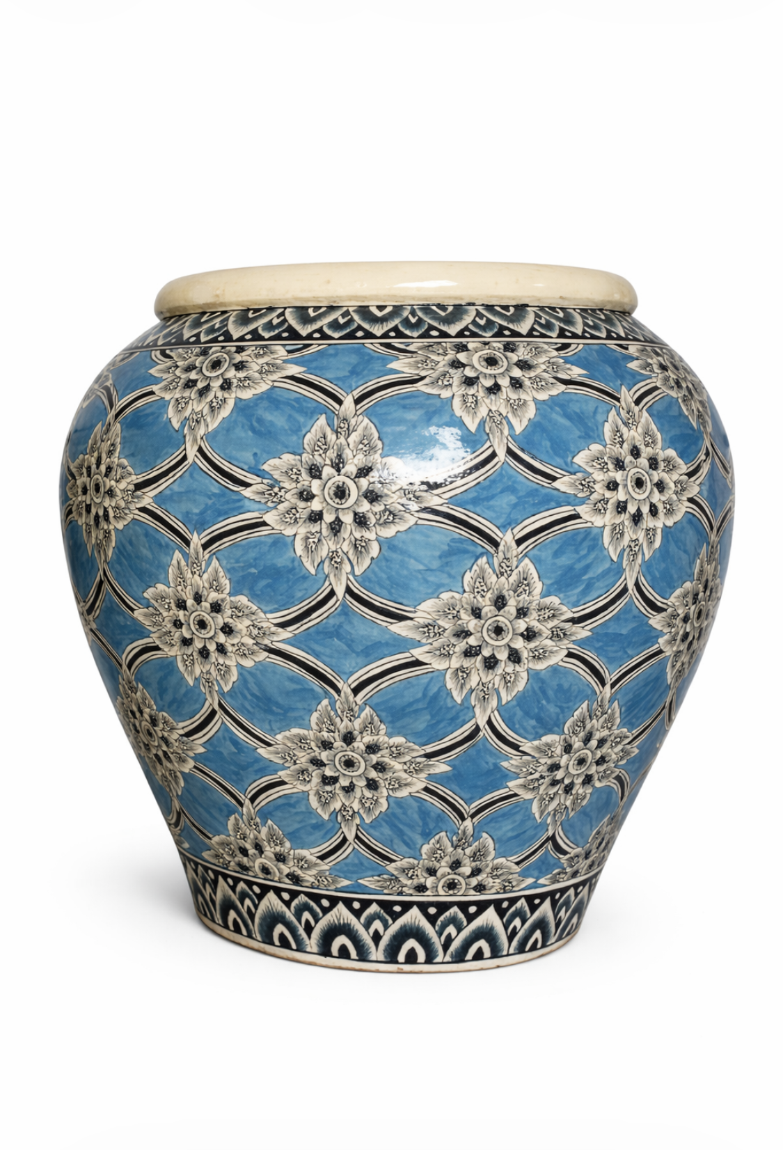 An exquisite hand-painted ceramic jardinière in rich summer blue, beautifully accented with indigo detailing and intricate floral patterning. This elegant statement piece blends traditional craftsmanship with timeless decorative appeal, making it ideal for luxurious interiors, garden rooms, patios, or entranceways. A truly eye-catching planter designed to add colour, character, and sophistication to any space.