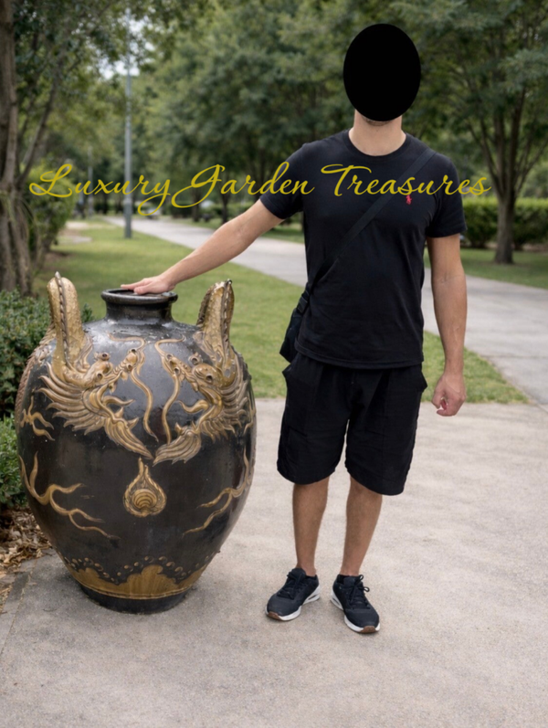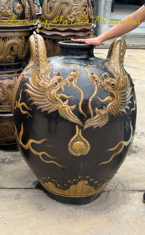 A truly commanding and exceptionally large hand-crafted Thai dragon jar, finished in a rich deep brown glaze with striking raised golden dragon detailing. Inspired by traditional Thai artistry, this impressive decorative vessel features beautifully sculpted twin dragon handles and intricate hand-finished motifs, giving it a bold, regal presence from every angle.